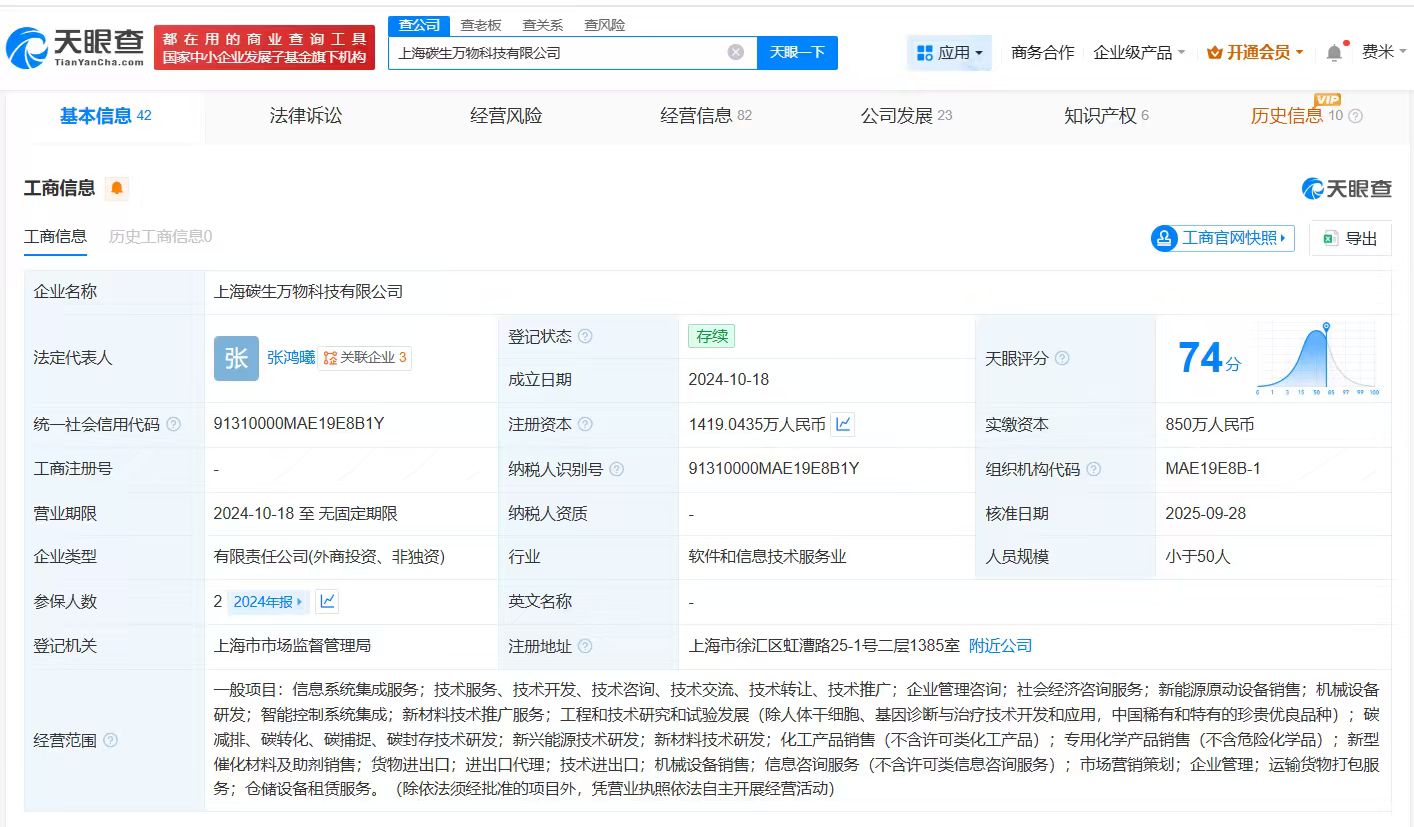 该公司成立于2024年10月,法定代表人为张鸿曦,经营范围包括信息系统集成服务、企业管理咨询、社会经济咨询服务等,现由Yuxiang Ren、张鸿曦及上述新增股东等共同持股。公开资料显示,该公司聚焦碳科技与新材料领域创新应用,致力于为化工、能源行业提供清洁技术解决方案。