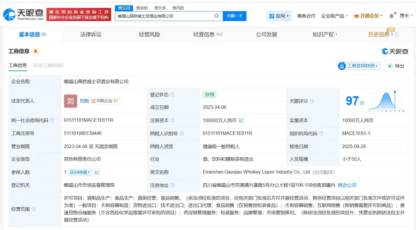 天眼查App显示,近日,峨眉山高桥威士忌酒业有限公司发生工商变更,注册资本由3亿人民币增至10亿人民币,增幅约233%。