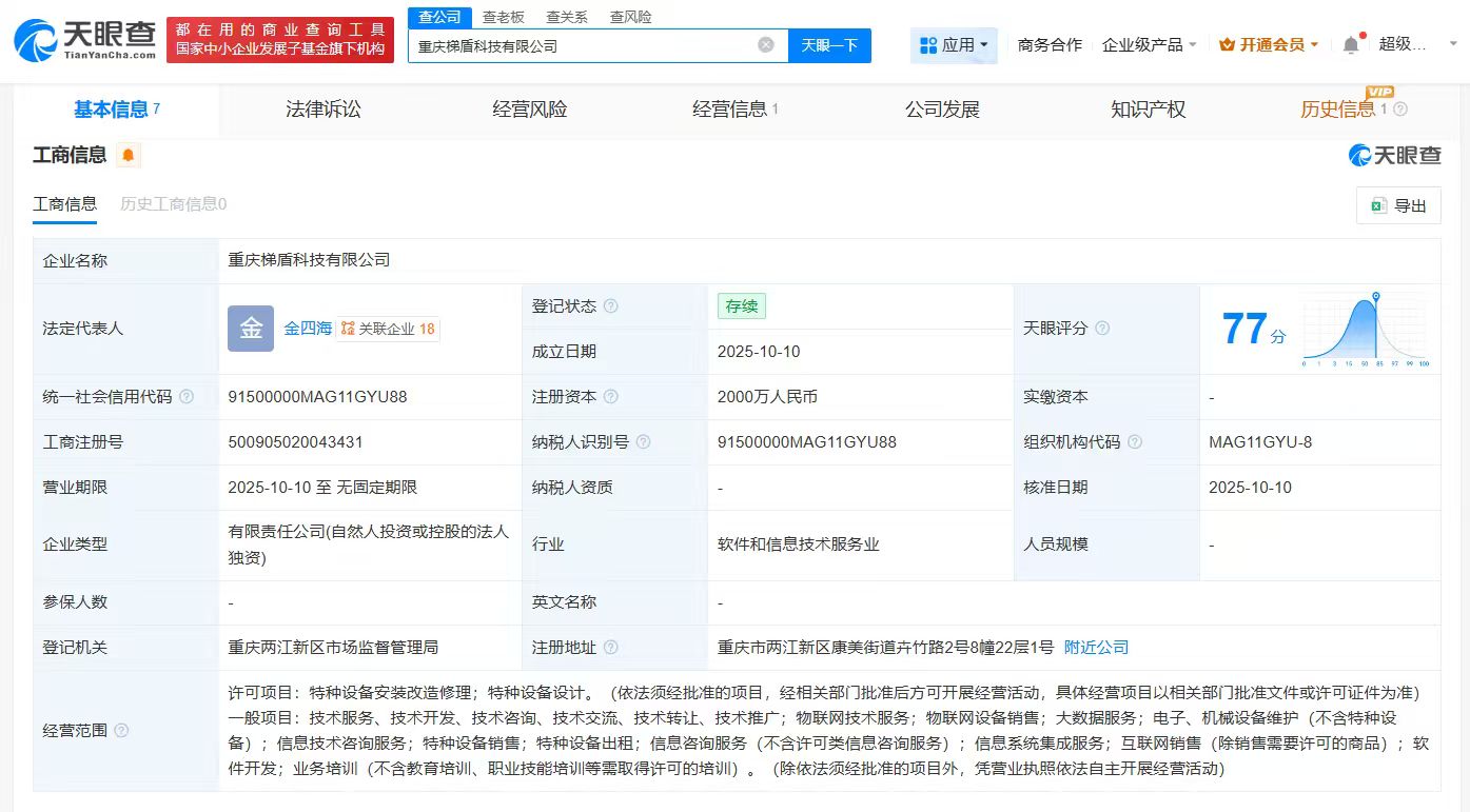 天眼查App显示,近日,重庆梯盾科技有限公司成立,法定代表人为金四海,注册资本2000万人民币,经营范围包括特种设备安装改造修理、特种设备设计、大数据服务、特种设备出租等。股东信息显示,该公司由重庆啄木鸟网络科技有限公司全资持股。