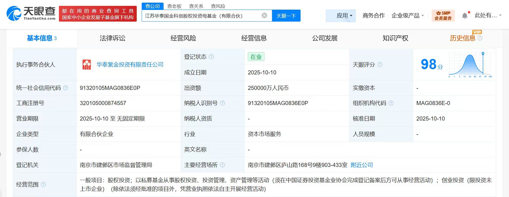 天眼查工商信息显示,近日,江苏华泰国金科创股权投资母基金(有限合伙)成立,执行事务合伙人为华泰紫金投资有限责任公司,出资额25亿人民币,经营范围为股权投资,以私募基金从事股权投资、投资管理、资产管理等活动,创业投资。合伙人信息显示,该基金由江苏金财投资有限公司、华泰证券(601688)旗下华泰紫金投资有限责任公司分别持股60%、40%。