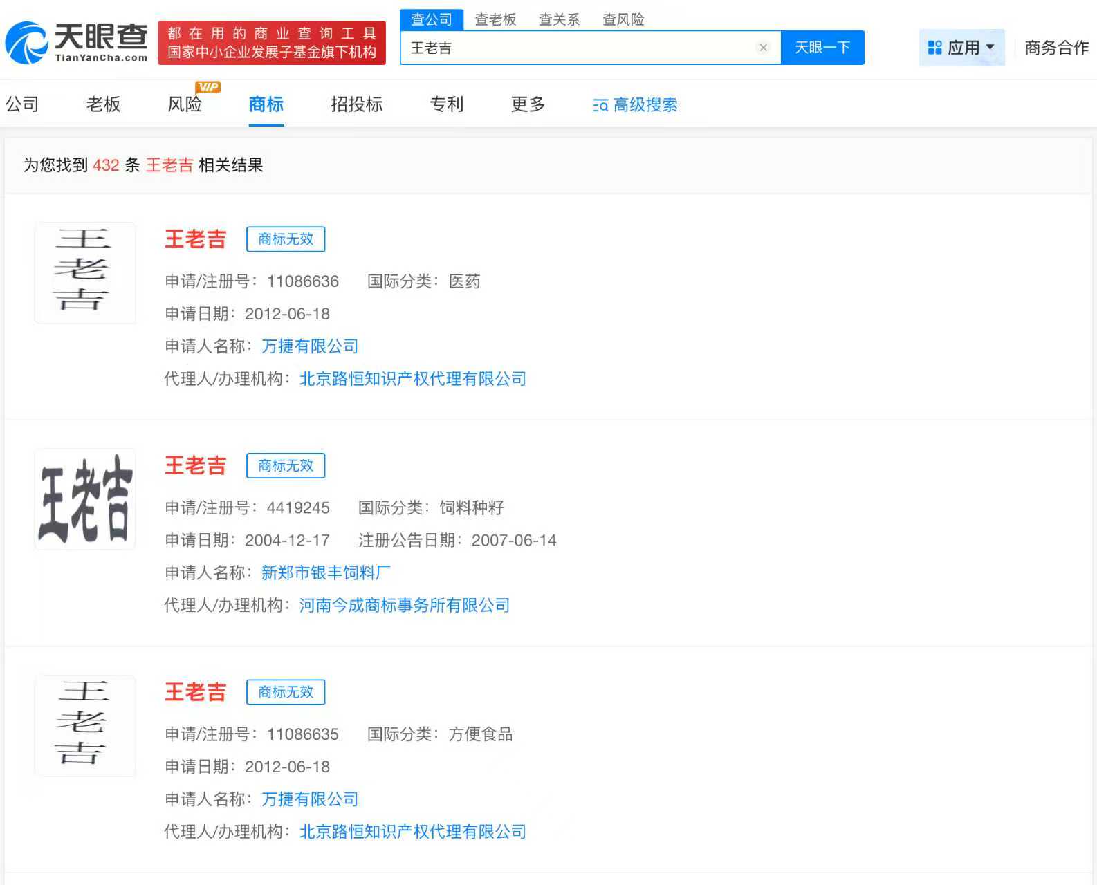 天眼查App显示,“王老吉”已被多方申请注册为商标,国际分类包括医药、饲料种籽、方便食品等,申请人包括万捷有限公司、新郑市某饲料厂等。当前上述商标多已被驳回。此外,广州白云山医药集团股份有限公司已申请注册多枚“王老吉”商标,当前商标状态多为已注册。