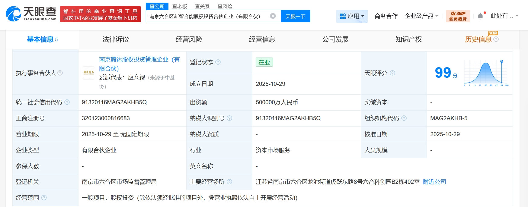 天眼查App显示,近日,南京六合区新智合能股权投资合伙企业(有限合伙)成立,执行事务合伙人为南京毅达股权投资管理企业(有限合伙),出资额50亿人民币,经营范围为股权投资。合伙人信息显示,该企业由南京六合经济开发区科技创业有限公司、南京六合兴棠投资有限公司、南京毅达股权投资管理企业(有限合伙)共同出资。
