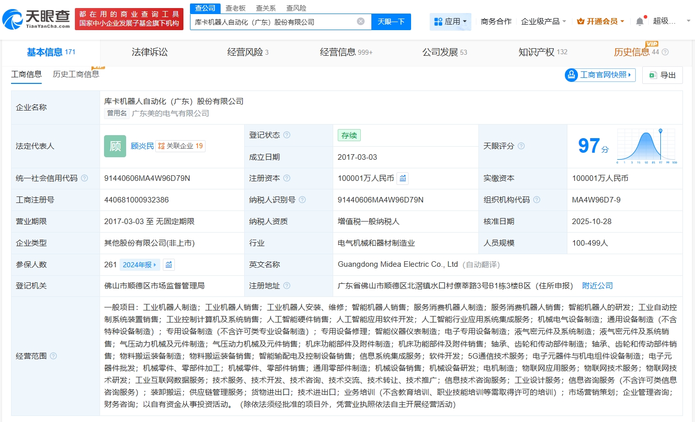 天眼查App显示,近日,广东美的电气有限公司发生工商变更,企业名称变更为库卡机器人自动化(广东)股份有限公司,同时经营范围及部分高管发生变更。