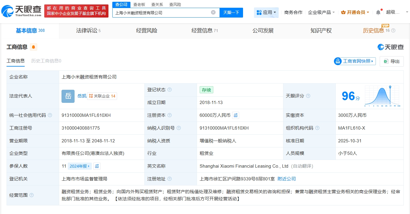 该公司成立于2018年11月,法定代表人为岳凯,经营范围包括融资租赁业务、租赁业务、向国内外购买租赁财产、租赁财产的残值处理及维修等。股东信息显示,该公司由小米金融(香港)有限公司全资持股。