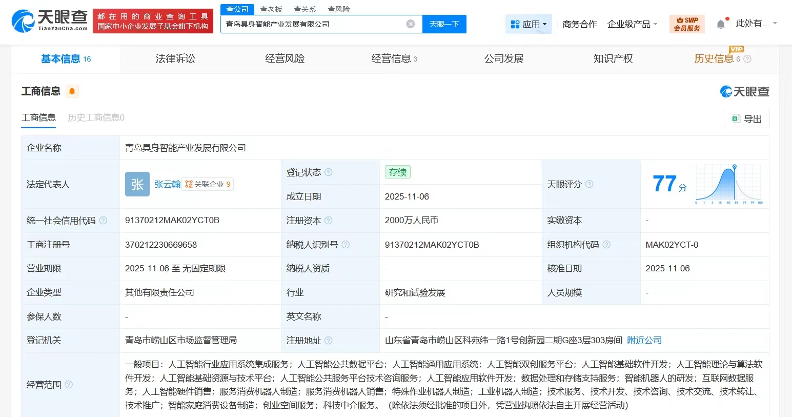 天眼查工商信息显示,近日,青岛具身智能产业发展有限公司成立,法定代表人为张云翰,注册资本2000万人民币,经营范围含人工智能行业应用系统集成服务、人工智能公共数据平台、人工智能通用应用系统、人工智能双创服务平台、人工智能基础资源与技术平台、数据处理和存储支持服务、智能机器人的研发等。股东信息显示,该公司由中科紫东太初(北京)科技有限公司、青岛人工智能产业创新中心有限公司、国华(青岛)智能装备有限公司共同持股。