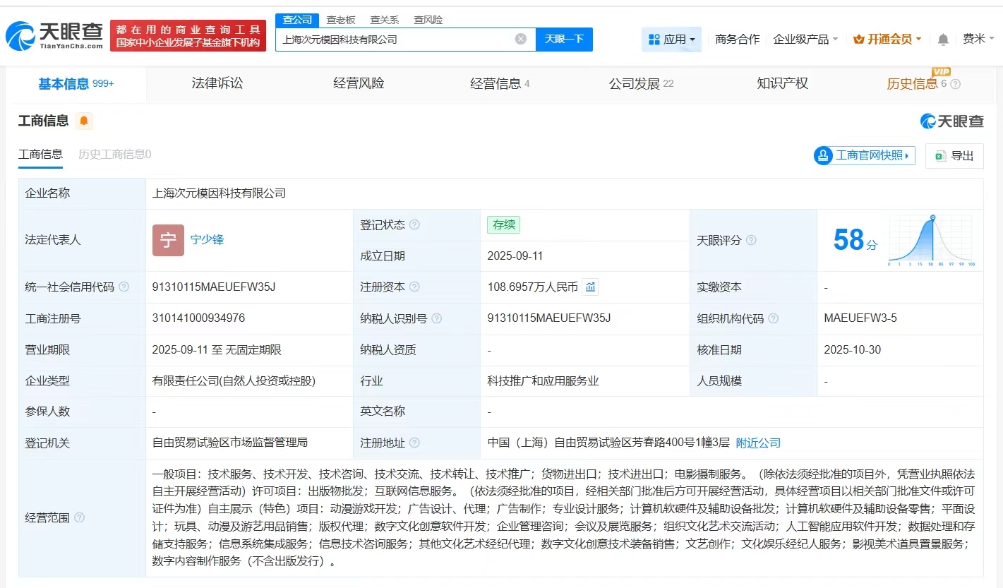 上海次元模因科技有限公司成立于今年9月,法定代表人为宁少锋,经营范围包括电影摄制服务、动漫游戏开发、广告制作等。股东信息显示,该公司现由宁少锋及上述新增股东共同持股。公开资料显示,该公司致力于通过 AI技术降低动画创作门槛,为内容创作者提供更便捷、高效的创作工具。