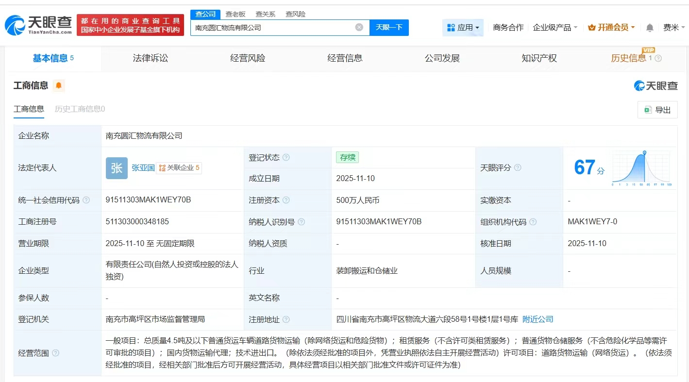 天眼查App显示,近日,南充圆汇物流有限公司成立,法定代表人为张亚国,注册资本500万人民币,经营范围包括租赁服务、普通货物仓储服务、国内货物运输代理等。股东信息显示,该公司由圆通速递有限公司全资持股。