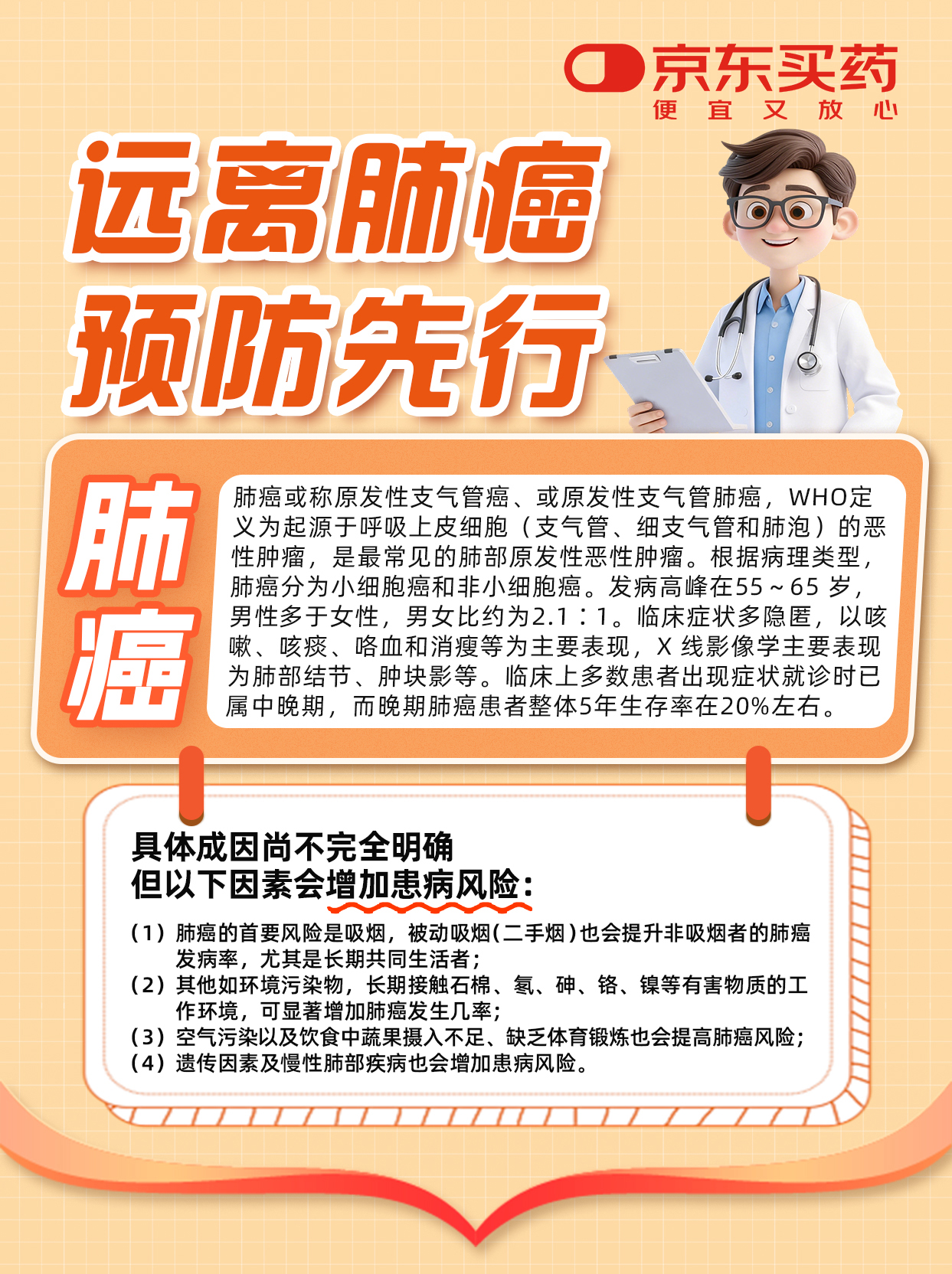 在用药指导及健康支持外,京东健康也持续传递肺癌康复过程中的全方位关怀理念。从饮食上建议适当高蛋白、高维生素、高热量饮食,增强免疫力;到术后呼吸功能恢复的锻炼指导;再到强调彻底戒烟、限制酒精摄入对康复的关键作用;以及鼓励患者与家属保持积极心态,必要时寻求专业心理支持。通过各个方面的丰富科普内容,京东健康致力于在医学治疗之外,为患者营造更温暖、更系统的康复环境。