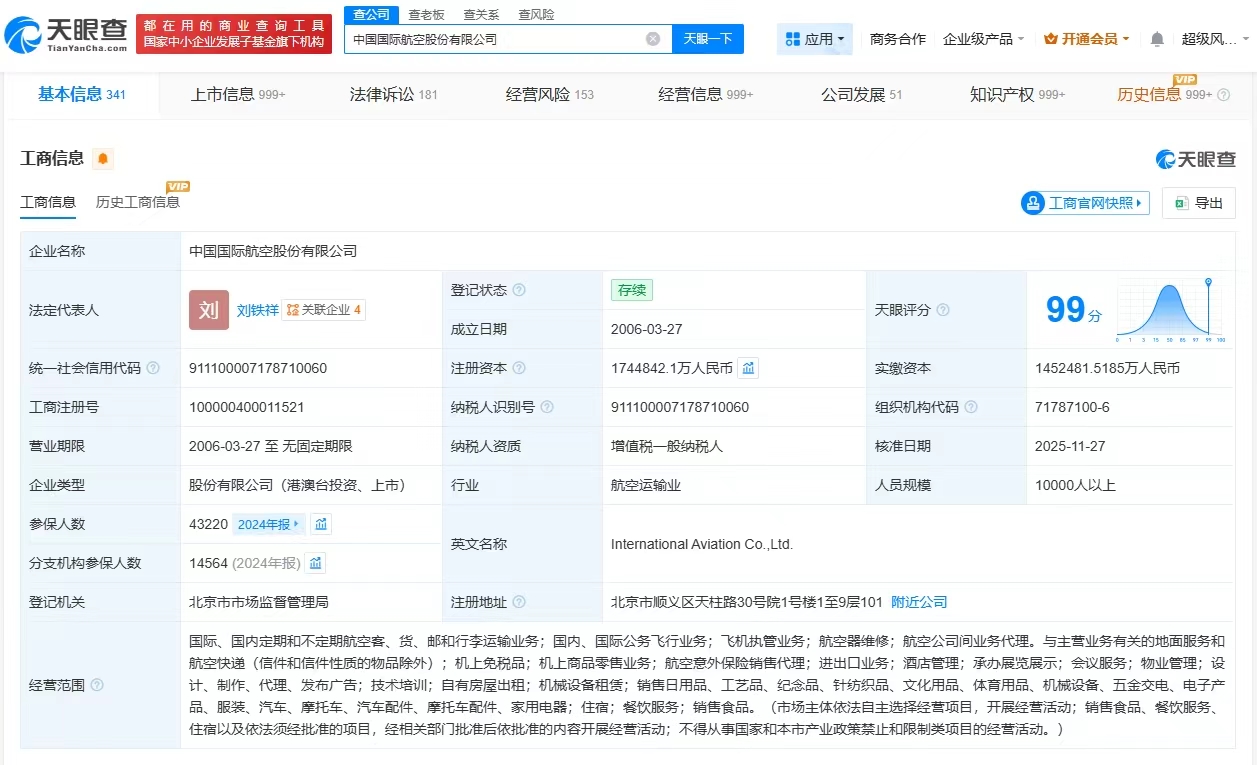 天眼查App显示,近日,中国国航(601111)发生工商变更,马崇贤卸任法定代表人、董事长,由刘铁祥接任,注册资本由约162亿人民币增至约174.48亿人民币,同时多位主要人员发生变更。