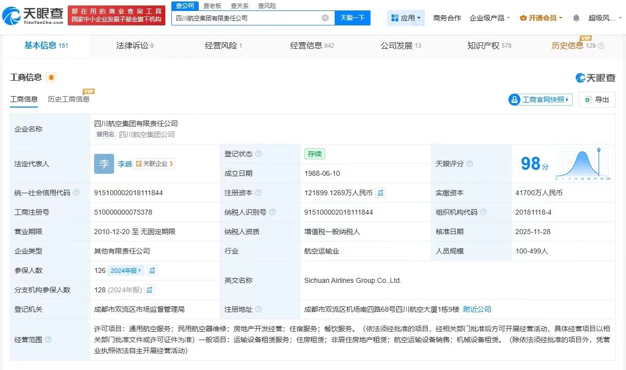 天眼查工商信息显示,近日,四川航空集团有限责任公司发生工商变更,新增四川省宜宾五粮液集团有限公司为股东,注册资本由4.17亿人民币增至约12.19亿人民币。