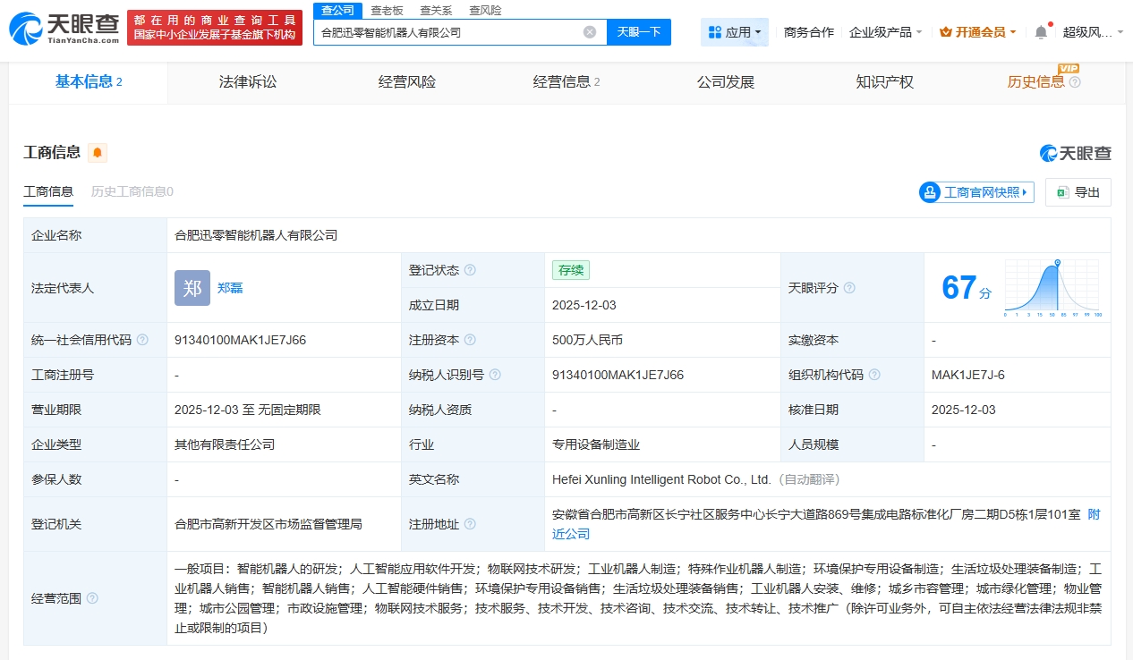 天眼查App显示,近日,合肥迅零智能机器人有限公司成立,法定代表人为郑磊,注册资本500万人民币,经营范围包括智能机器人的研发、人工智能应用软件开发、物联网技术研发、工业机器人制造等。股权全景穿透图显示,该公司由劲旅环境(001230)旗下上海迅零智能科技有限公司全资持股。