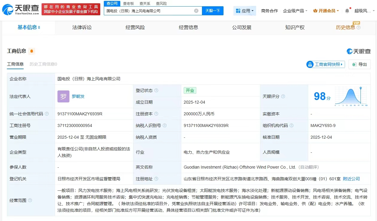 天眼查App显示,近日,国电投(日照)海上风电有限公司成立,法定代表人为罗朝发,注册资本20亿人民币,经营范围包括风力发电技术服务、海上风电相关系统研发、光伏发电设备租赁、太阳能发电技术服务、新能源汽车换电设施销售等。股权全景穿透图显示,该公司由中国电力(02380.HK)旗下国家电投集团山东能源发展有限公司全资持股。