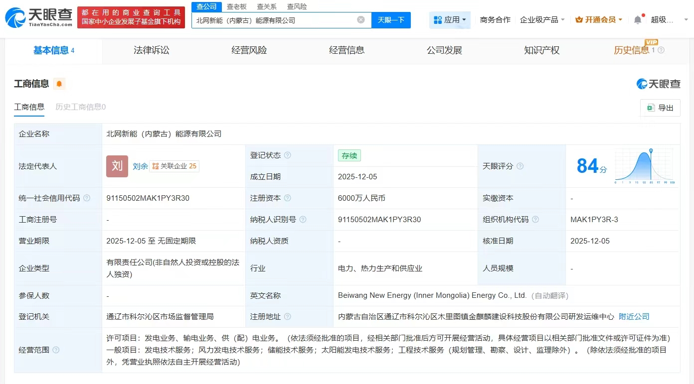 天眼查App显示,近日,北网新能(内蒙古)能源有限公司成立,法定代表人为刘余,注册资本6000万人民币,经营范围包括电技术服务、风力发电技术服务、储能技术服务、太阳能发电技术服务等。股东信息显示,该公司由晨丰科技(603685)全资持股。