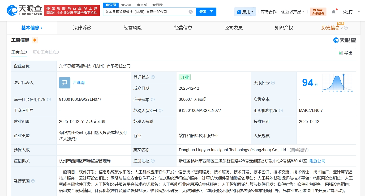 天眼查App显示,近日,东华灵曜智能科技(杭州)有限责任公司成立,法定代表人为尹继南,注册资本3亿人民币,经营范围含信息系统集成服务、人工智能应用软件开发、信息技术咨询服务、云计算装备技术服务、云计算设备销售、网络与信息安全软件开发、信息系统运行维护服务、计算机软硬件及辅助设备零售、人工智能基础资源与技术平台、物联网设备销售等。股东信息显示,该公司由东华软件(002065)全资持股。